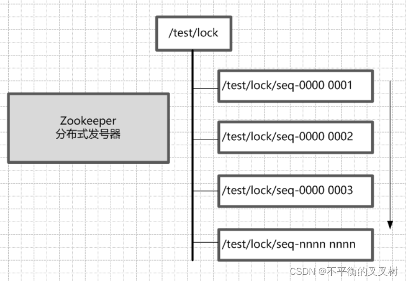 比如现在有客户端A要对/LOCK节点加锁,Zookeeper会先在/LOCK下面创建一个顺序节点(假设编号为/LOCK-1),然后客户端A会查一下/LOCK这个锁节点下的所有顺序节点,A会做一个判断,我创建的那个顺序节点是不是最小的,如果是,则加锁成功。如果此时客户端B也想要加锁,B也得先在/LOCK下面创建一个顺序节点(假设编号为/LOCK-2),因为A还没有释放锁,所以此时/LOCK下面有两个顺序节点,然后B也要查一下/LOCK下面所有的顺序节点并判断自己创建的顺序节点是不是最小的,如果不是,则一直监听上一个比自己小的顺序节点的删除事件。如果A释放了锁,也就是A创建的顺序节点被删除了,Zookeeper就会通知监听这个顺序节点的监听器,也就是客户端B之前加的那个监听器,此时客户端B就可以成功获取锁了(因为它的顺序节点是最小的了)。