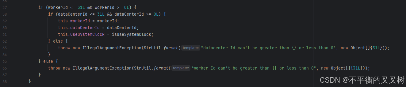 hutool工具有对配置的workerId 和 datacenterId进行范围校验。不在取值范围里将会出现异常。