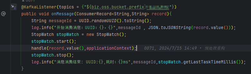 在我们项目中,某个服务监听了该topic的消息,并且该服务已配置了自己的消费者组id。