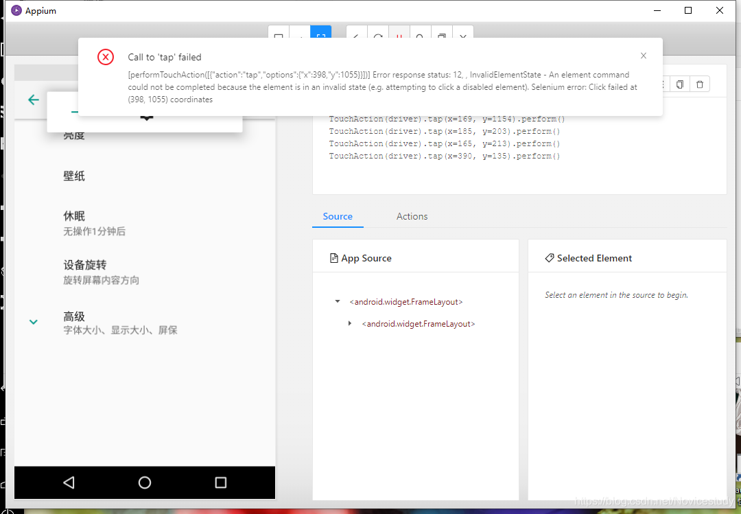 使用Appium进行自动化测试时,尝试通过位置录制脚本调节设备亮度并点击屏幕空白区域,但遇到错误:"Call to 'tap' failed...InvalidElementState - An element command could not be completed because the element is in an invalid state"。已尝试重启Appium、模拟器和电脑,问题依旧存在,无论是直接在Appium中操作还是通过Python代码执行都会报相同错误。寻求解决方案。