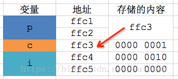 1.最初的时候,我们用char *p指向变量c。当利用*p来获取变量c的值时,由于指针p知道变量c是char类型的,所以会从ffc3这个地址开始读取1个字节的数据:0000 0001,转为10进制就是1