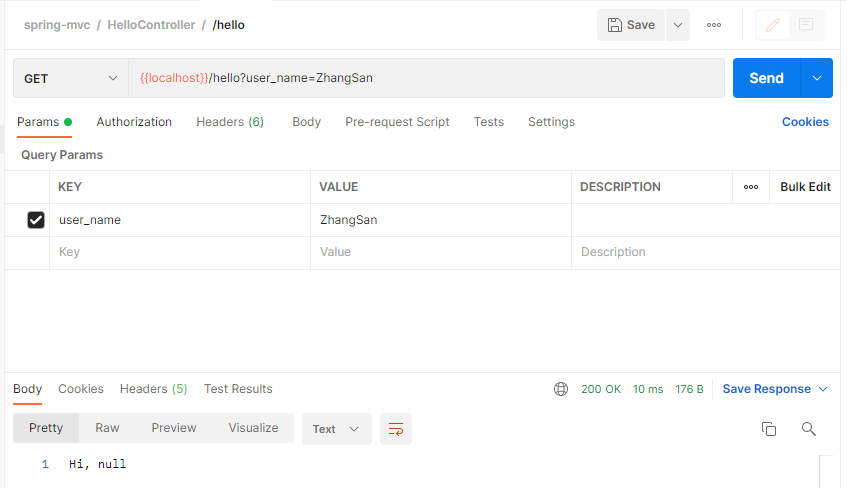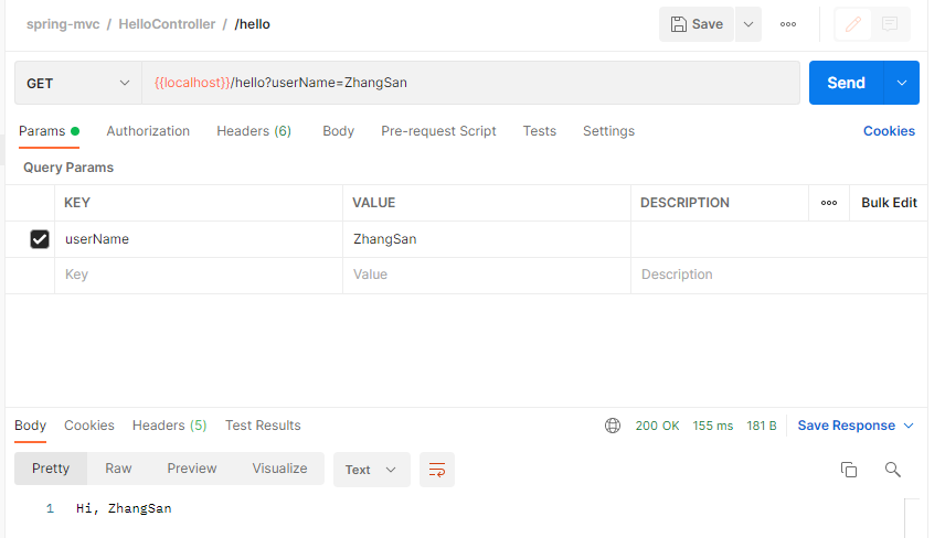 - 查询指定用户名用户:GET /hello?userName=ZhangSan