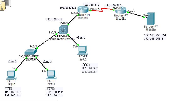 1、网络信息:学校网络由一台三层交换机作为核心,下边有3个学院,学院A有网络用户50人,学院B有网络用户230人,学院C有500人。学校出口有路由器A一台,外边连接另外一台互联网路由器B,路由器B下连接有web网络服务器192.168.255.254。