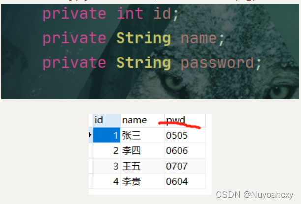 可以看到查出的数据中实体类的 password属性为null,因为mybatis没有从数据库中找到对应的字段名