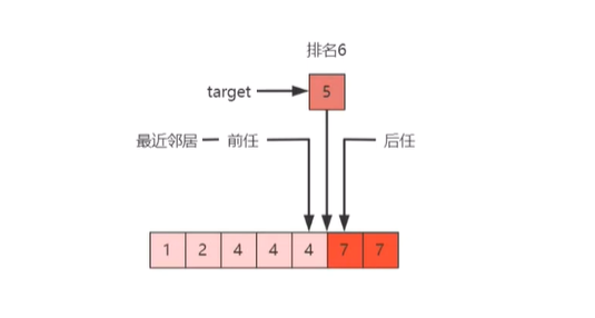 什么叫最近邻居,它的意思是前任和后任加在一块,看谁更小,谁离 target 更近,就那图 38 的例子来说,排名 5 的 4 跟排名 6 的 5 中间是不是距离了一个位置,排名 7 的 7 跟排名 6 的 5 中间是不是距离了两个位置,所以我们说排名 5 的 4 就是 排名 6 的 5 的最近邻居。