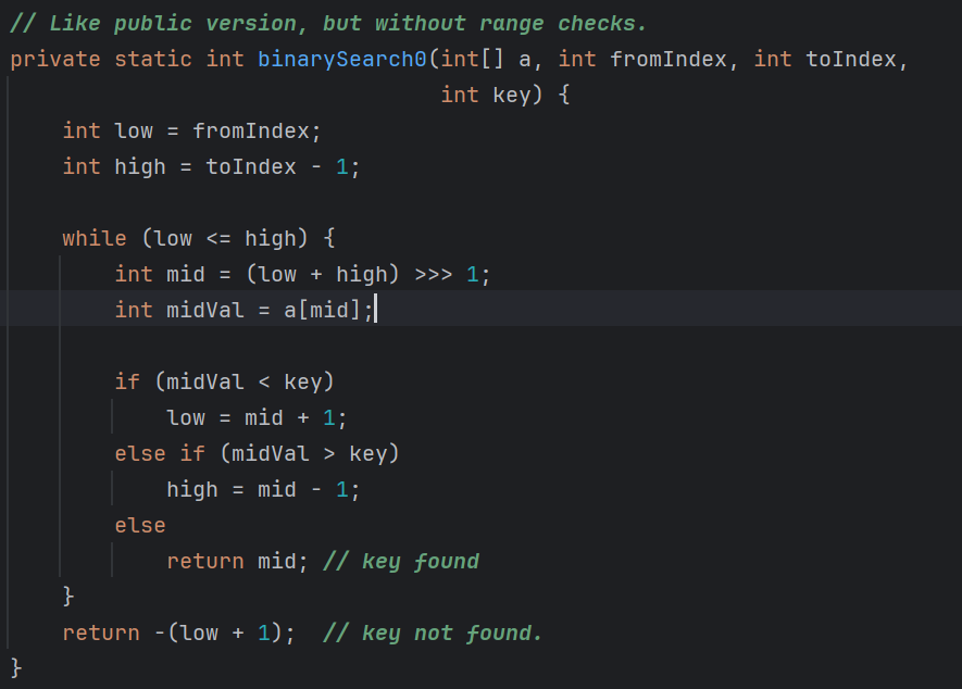 - 使用 int m = (i + j) >>> 1可以有效地解决这个问题。其中,>>> 是无符号右移运算符,它将十进制数的二进制表现形式整体向右移动一位,并在前面空出的位置补零。这样一来,原本超出范围的数就能被正确地表示出来。