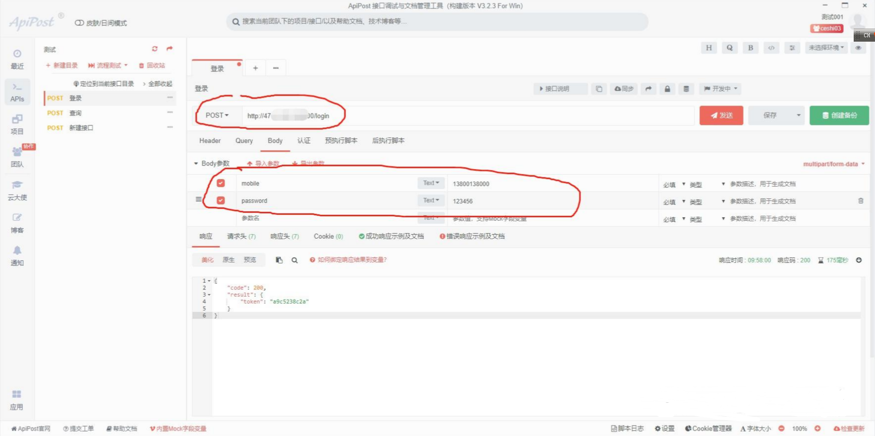 新建一个名叫登录的接口,选择post方法,输入需要测试的接口地址和需要传递的接口参数,登录名和密码