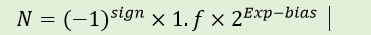 其中1.f表示52-bit尾数;Exp 表示存储起来的指数值;bias 表示偏置,对于标准双精度浮点,改值为1023;Exp-bias 表示实际的指数值。标准格式表示如图(a) 所示。然而,对于自定义浮点格式表示的数的实际值如下:
