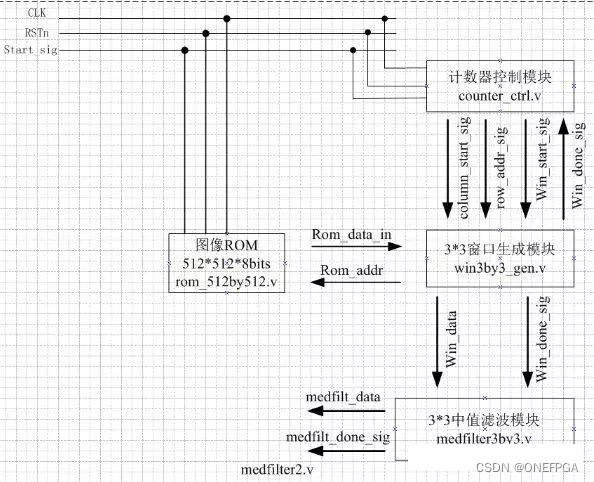 整个中值滤波模块分为几个小的模块:33窗口生成模块、计数器控制模块、33中值滤波模块、顶层模块以及最后的测试模块testbench的编写。
