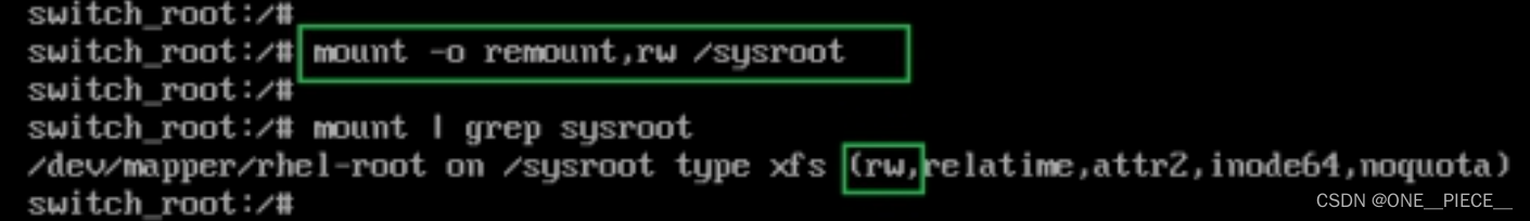 输入munt -o remount,rw /sysroot 回车 输入mount | grep sysroot 回车