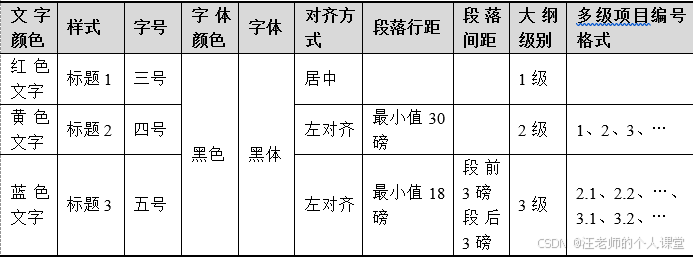 3.将论文中不同颜色的文字设置为标题格式,要求如下表。设置完成后,需将最后一页的“参考文献”段落设置为无多级编号。