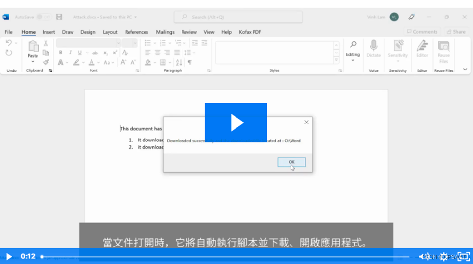 下面这个影片将示范VSTO Word 文件如何在受害者的设备上下载和执行有害应用程式。