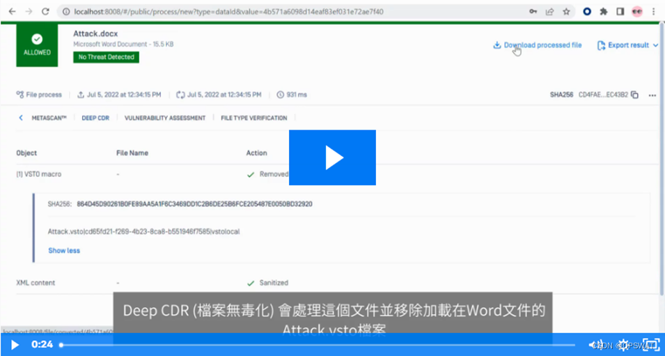 下面的影片将带您了解OPSWAT MetaDefender 如何使用 Deep CDR 来停用恶意 VSTO Word 文件。