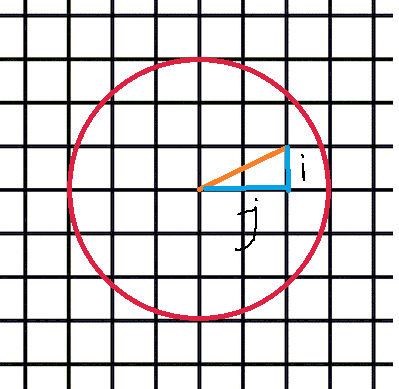 思路:1.每个格子里圆心最远的顶点 离圆心的距离小于等于半径则该格子完整地在圆里。
