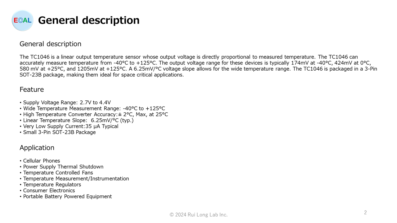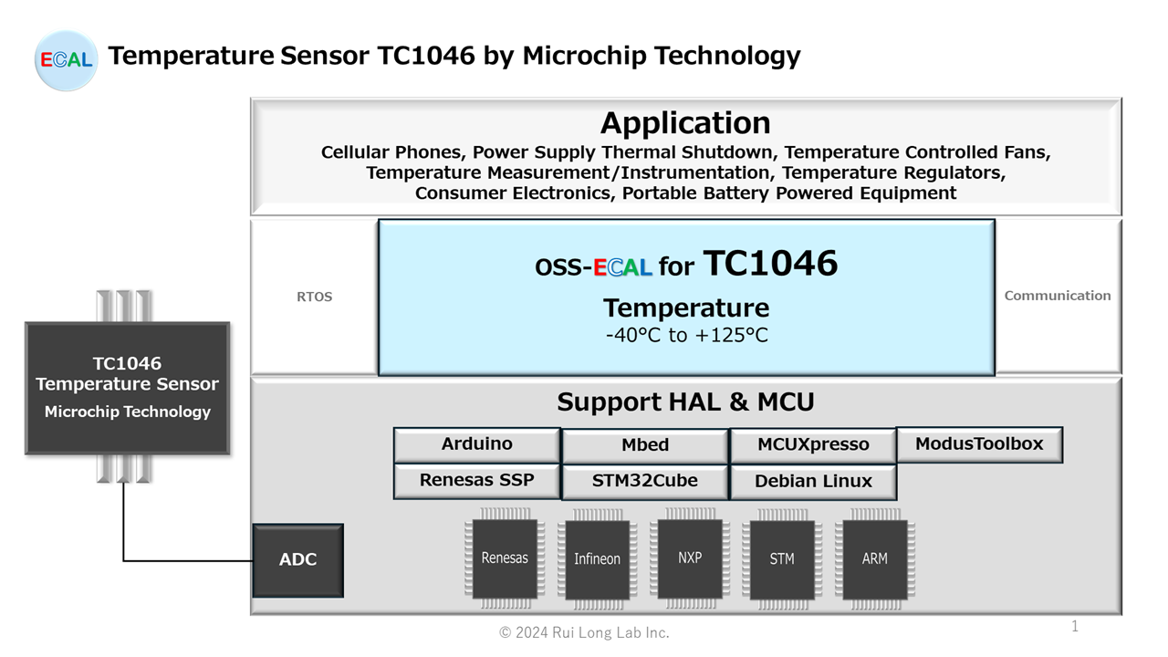 TC1046 的概述以及TC1046 用OSS-ECAL 的提供情况。TC1046 是 Microchip Technology 公司生产的温度传感器IC(温度范围为 -40 ℃ 至 +125 ℃)。 中文说明请参阅网站。 OSS-ECAL API 功能描述: 支持 HAL: OSS-ECAL: 是电子元件抽象层开源软件的缩写。Open-Source Software for Electronic Components Abstraction Layer 我将为您提供对您有用的电子元件的OSS,请随意使用。 此致,敬礼。
