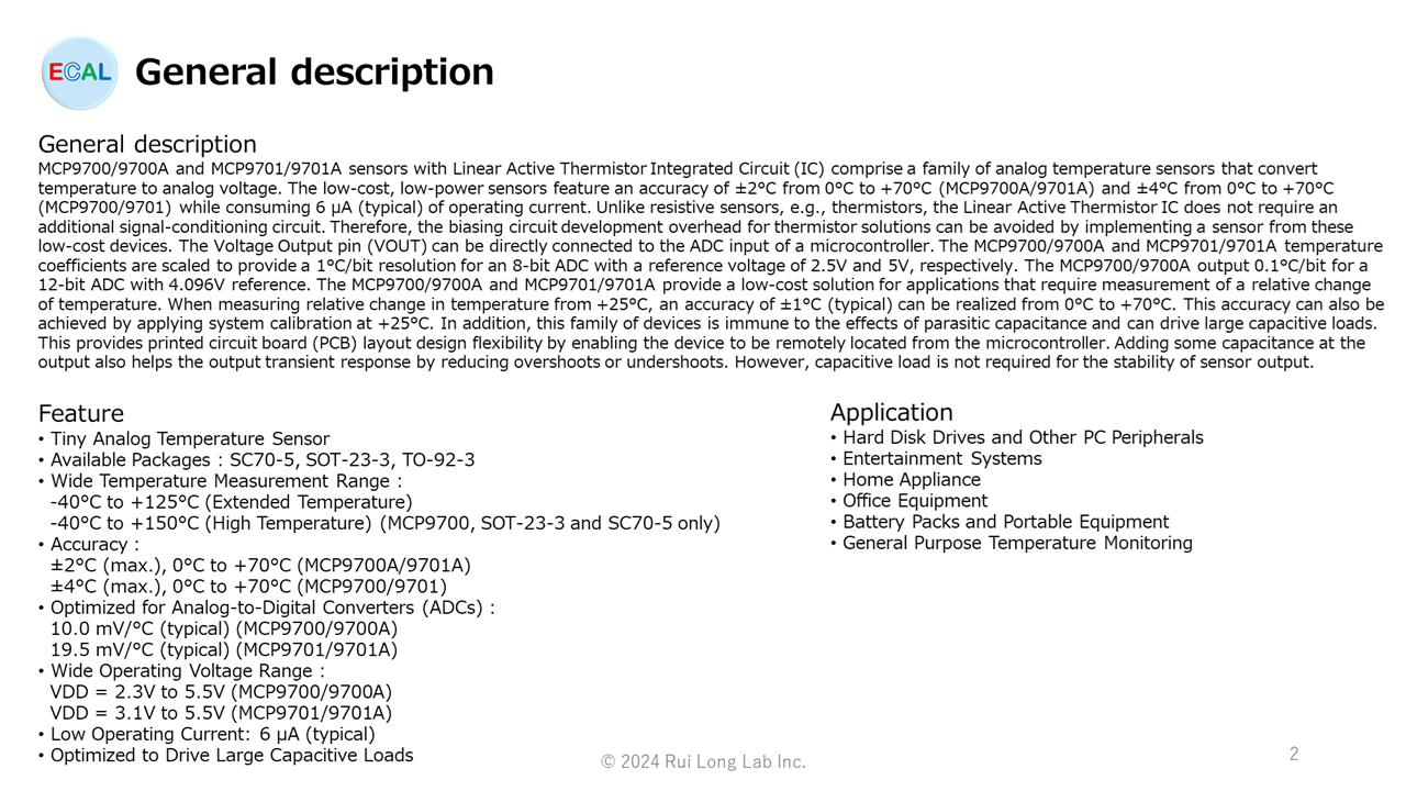 MCP9700 series (MCP9700, MCP9700A)的概述以及 MCP9700 series 用OSS-ECAL的提供情况。MCP9700 series 是 Microchip Technology 公司生产的温度传感器IC(温度范围为 -40 ℃ 至 +125 ℃)。