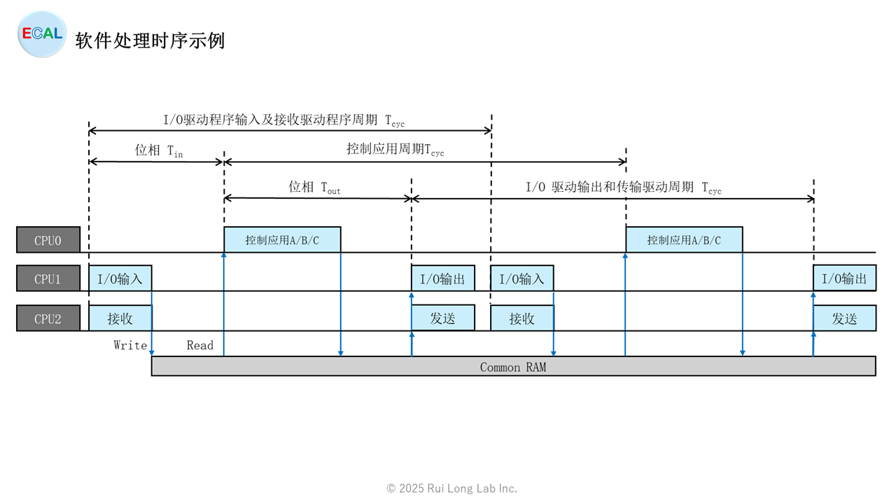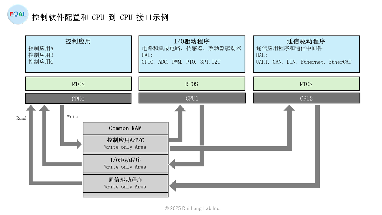 如下图和下表所示,控制软件配置分为每个 CPU 的功能。假定每个 CPU 都有足够的处理时间。