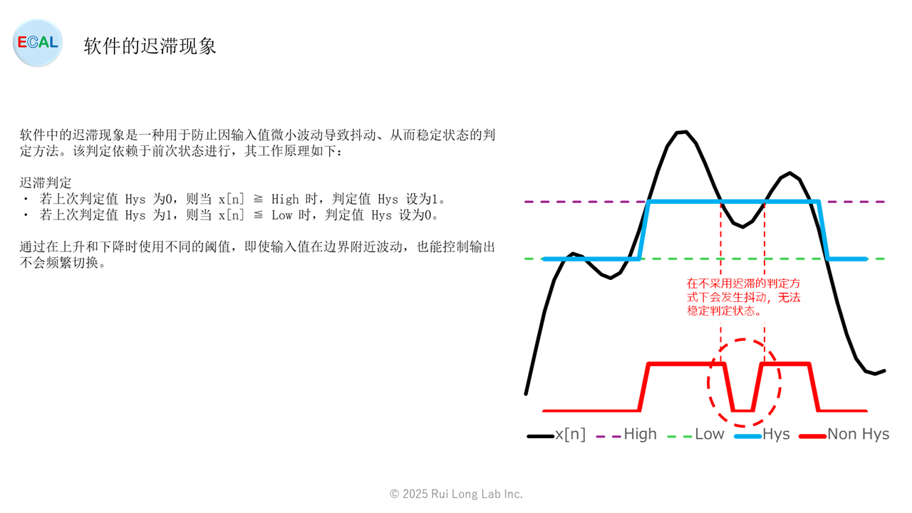 软件中的迟滞现象是一种用于防止因输入值微小波动导致抖动、从而稳定状态的判定方法。该判定依赖于前次状态进行,其工作原理如下: