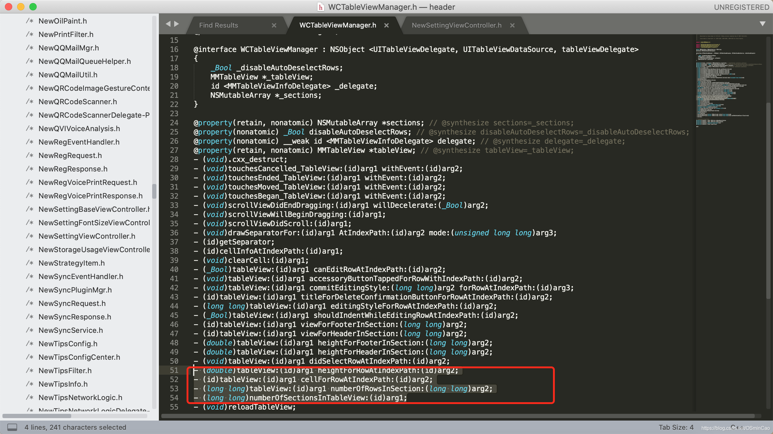 我们monkey完微信的越狱版本后,进入我的设置页面,viewDubug中,如图所示,我们可以看到这个页面中的tableview是一个叫WCtableView的,我们的需求是在这个设置页面中添加2个cell,一个叫抢红包的,一个叫等待时间的,我们需要找到该tableview的datasource,一般你放在controller中,我们找到该MCtableview的上层控制器为NewSettingViewController,我们dump下微信的头文件,在subline中打开,我们找到NewSettingViewController,可以看到代理中没有datasource的数据源代理,如下代码中所示,: