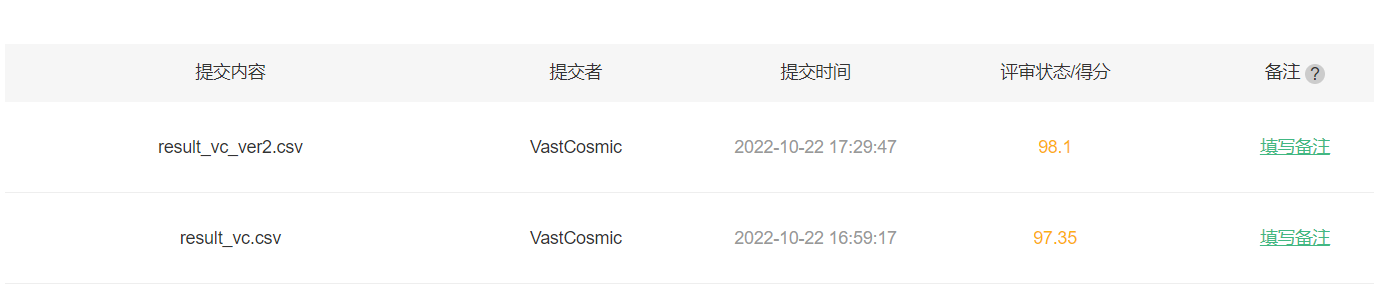 将csv文件下载到本地,手动进行排序后上传比赛网站。得到评测结果为97.35分。