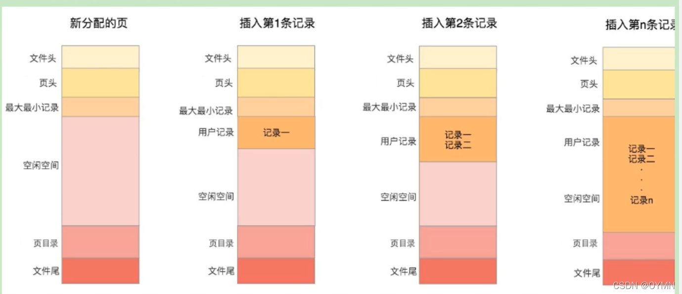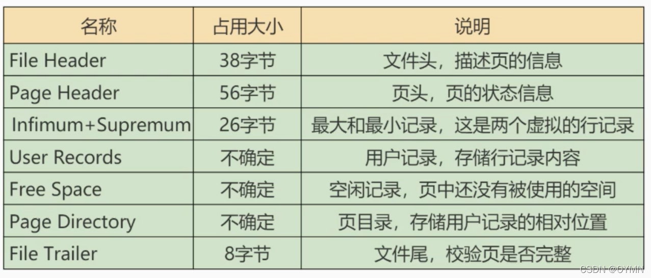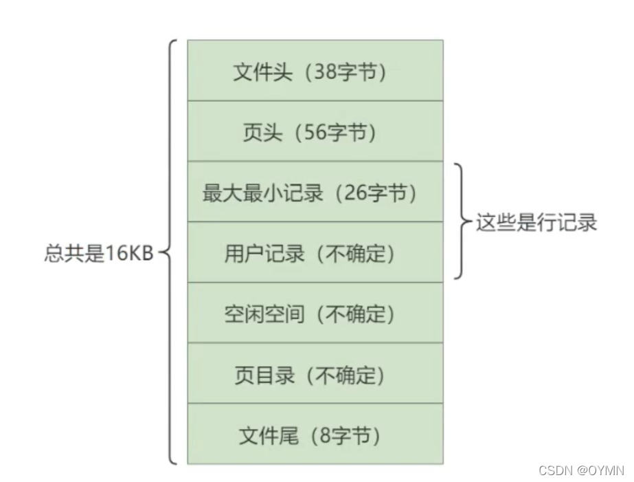 数据页的16KB大小的存储空间被划分为七个部分,分别是文件头(File Header),页头(Page Header),最大最小记录(Infimum+supermum),用户记录(User Records),空闲时间(Free Space),页目录(Page Directory)和文件尾(File Tailer)。