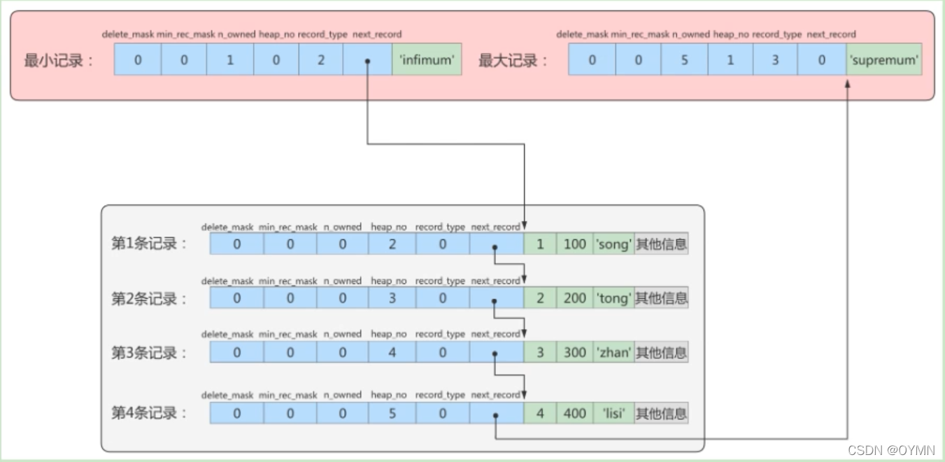 用户记录也就是我们的一条一条的数据,相互之间通过单链表连接。
