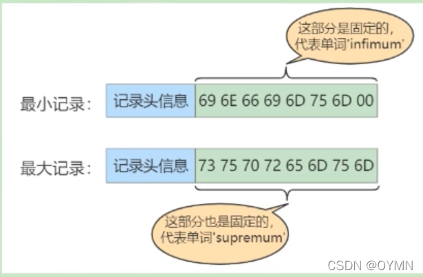 InnoDB规定的最小记录和最大记录这两条记录的构造很简单,都是由5个字节的记录头信息和8字节的固定的部分组成,如图: