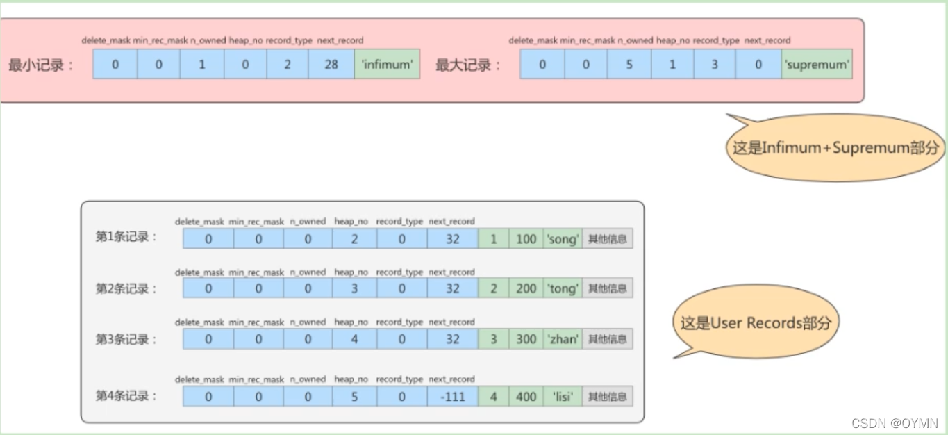 这里有个小知识点:我们自己添加的数据的heap_no会从2开始计数。MySQL会自动给每页添加两个记录,由于这两个记录并不是我们自己插入的,因此有时候也称为伪记录或者虚拟记录。这两个伪记录一个表示最小记录,一个表示最大记录,他们的heap_no值分别是0和1,代表着页内记录的开始和结束。
