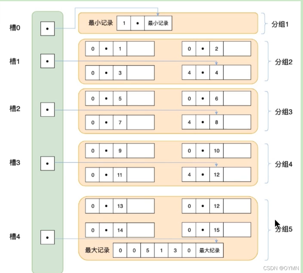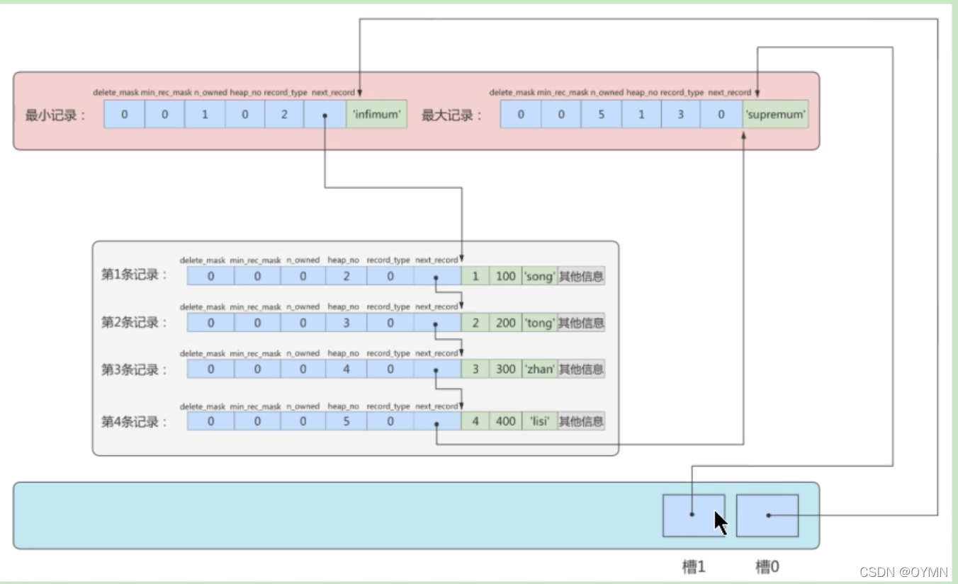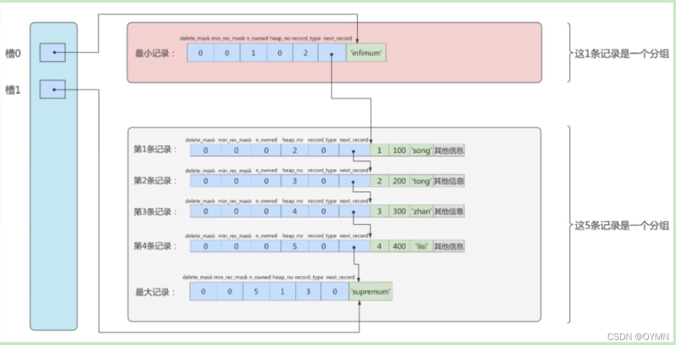 因此,页目录采取的方法是:将所有的记录(包括最小记录和最大记录,不包括被标记删除的记录)**分为几组,页目录存储每组最后一条记录的地址偏移量,这些地址偏移量按照先后顺序进行存储,**每组的地址偏移量也被称为槽(slot)。