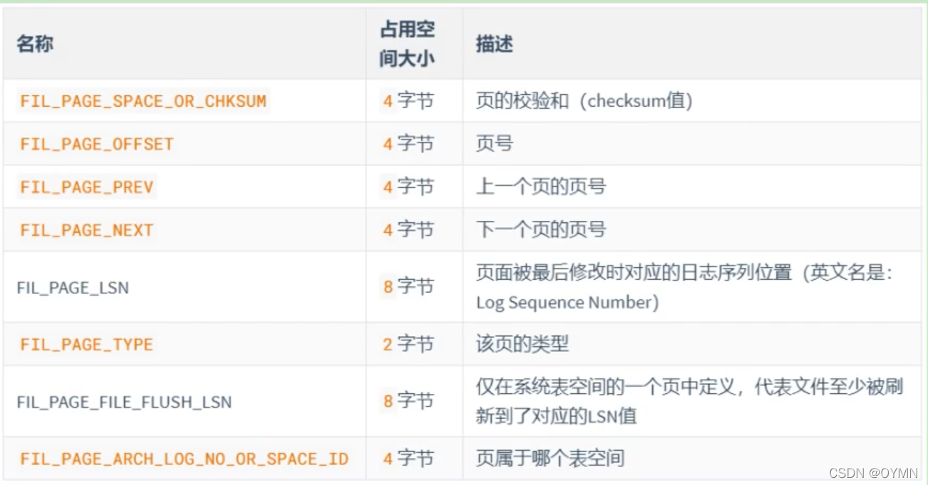 - FIL_PAGE_SPACE_OR_CHKSUM(4字节):页的校验和,和文件尾的校验和是一样的,成对存在。