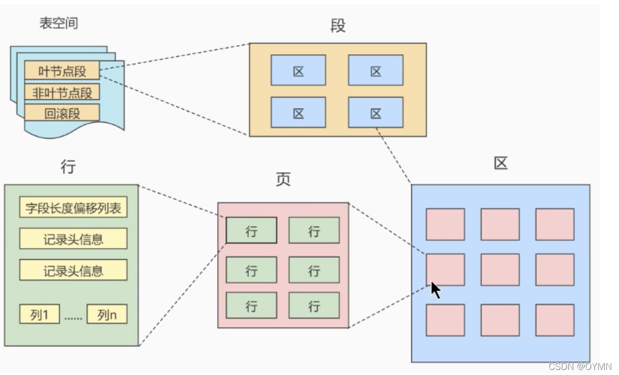 表空间:是一个逻辑容器,一个表空间可以有一个或多个段。数据库由一个或多个表空间组成,表空间从管理上可以划分为系统表空间,用户表空间,撤销表空间,临时表空间等。