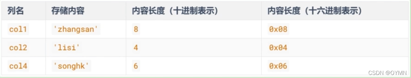 MySQL支持一些变长的数据类型,例如VARCHAR,TEXT,BLOB等,这些数据类型修饰的字段称为变长字段。由于变长字段中存储多少个字节不是固定的,所以我们在存储数据时需要将这些数据占用的字节数也存储下来。