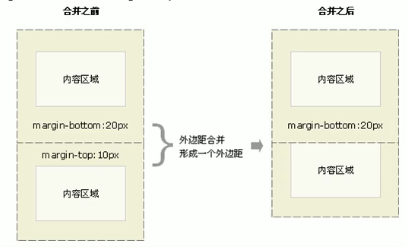 当上下相邻的两个块元索(兄弟关系)相遇时,如果上面的元素有下外边距margin-bottom,下面的元素有上外边距margin-top , 则他们之间的垂直间距不是margin-bottom+margin-top。取两个值中的较大者。