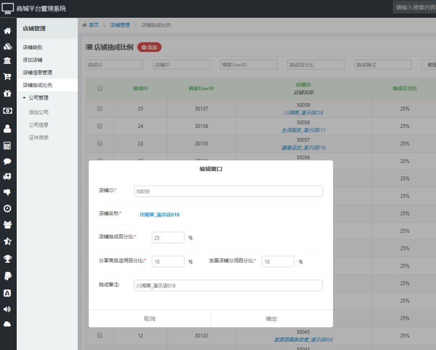 三、店铺抽成比设置:每个店铺根据和商家谈的抽成比,进行各项抽成相关的比例设置如:总的店铺抽成百分比,分享商品返佣百分比,发展店铺分润百分比等。因为很多商城平台的分润,返现,分佣,分红系统都是基于店铺的抽成,如果店铺没有抽成的话,那店铺不会参与任何的分润,返现,分佣,分红等营销机制。
