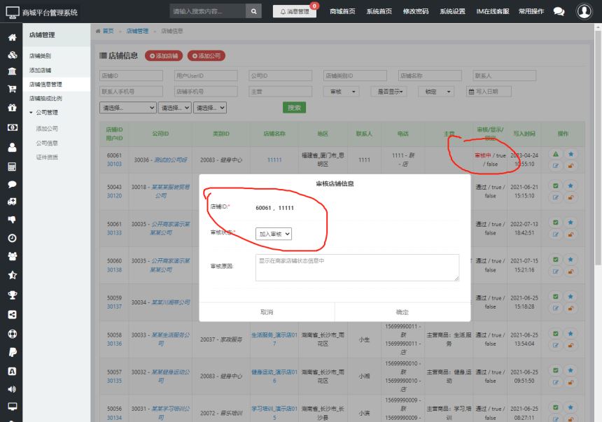 对于提交了商家入驻申请的用户,还需要平台的审核,平台管理员登录到平台CMS管理系统就可以看到所有用户提交的商家入驻申请,包括入驻商家的店铺信息,企业信息。管理员需要对其一一进行审核。如果用户提交的商家入驻申请信息都符合平台运营要求的话,就可以通过商家的入驻申请。通过审核后,商家店铺就可以正常的出售商品了。如下图: