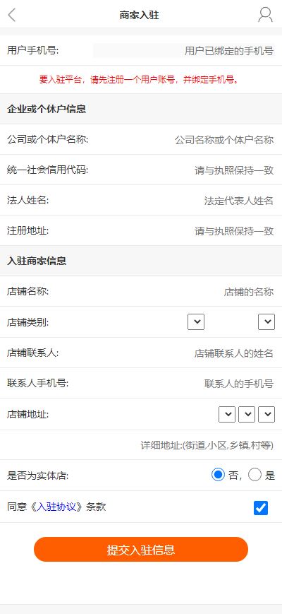 要入驻商家系统,首先,要注册成会商城平台的用户,即绑定手机号即可。然后,在买家客户端登录即可。我们在商城首页导航图标栏找到【商家入驻】的图标点击进入,就会进入到提交入驻申请的页面,如下图:
