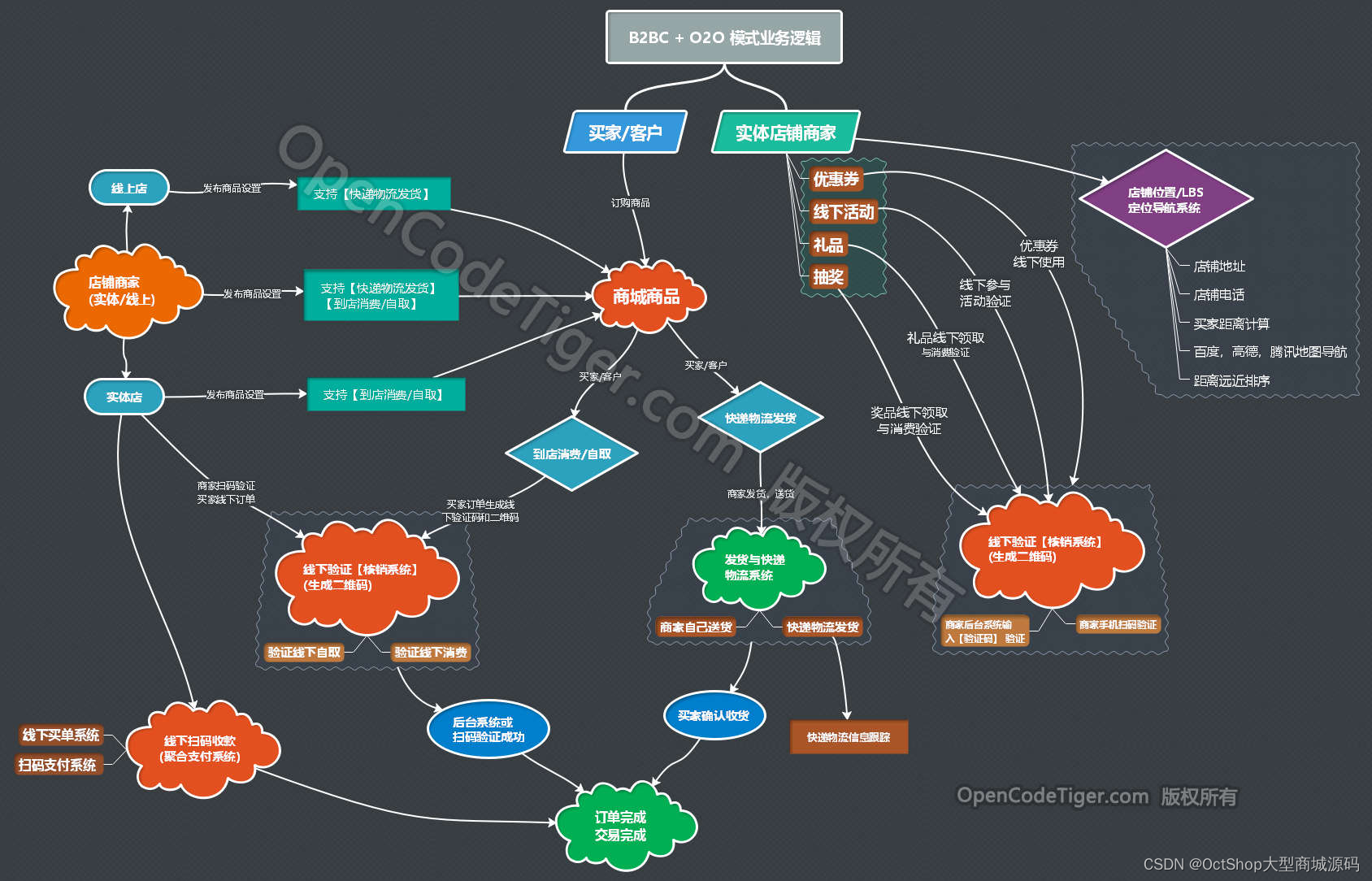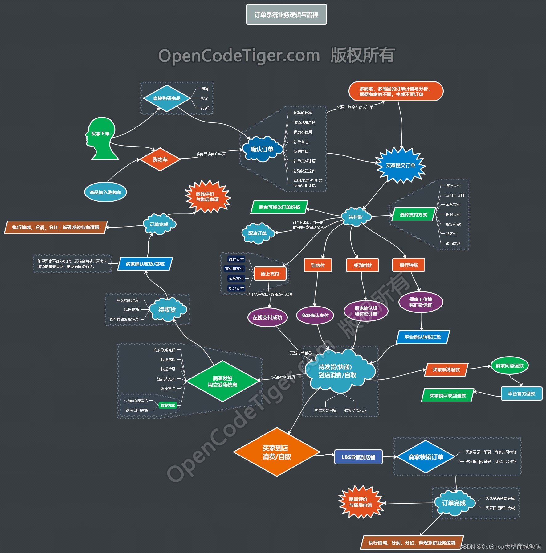 从OctShop大型开源商城系统的订单流程中可以看出所有系统与订单相关的交互流程。不同业务、角色与操作不同,根据业务模式与类型,系统架构的划分也不是绝对固定的。比如说,支付业务吧,不同的运营企业以及支付渠道是不一样的,还有结算流程与方式也不是固定的,需要根据企业实际情况进行对接。订单系统业务流程,如下图: