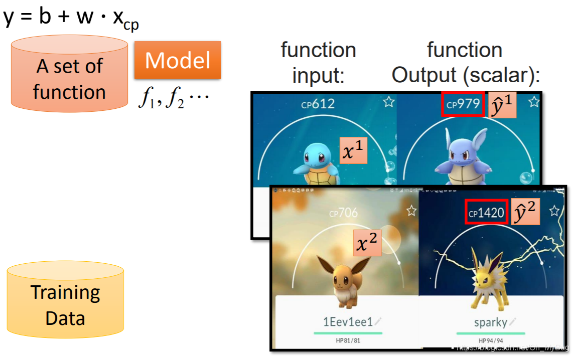 其中,xix^ixi代表第iii只Pokemon精灵所包含的特征(目前只有进化前的CP值xcpx_{cp}xcp),y^i\hat{y}^iy^i代表第iii只Pokemon精灵进化后的实际CP值。