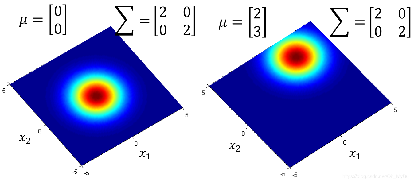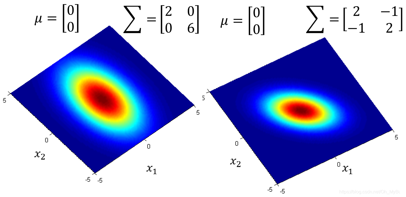 - Gaussian Distribution(高斯分布)的形状决定因素:mean(期望) μ \mu μ和covariance matrix(协方差矩阵) Σ \Sigma Σ