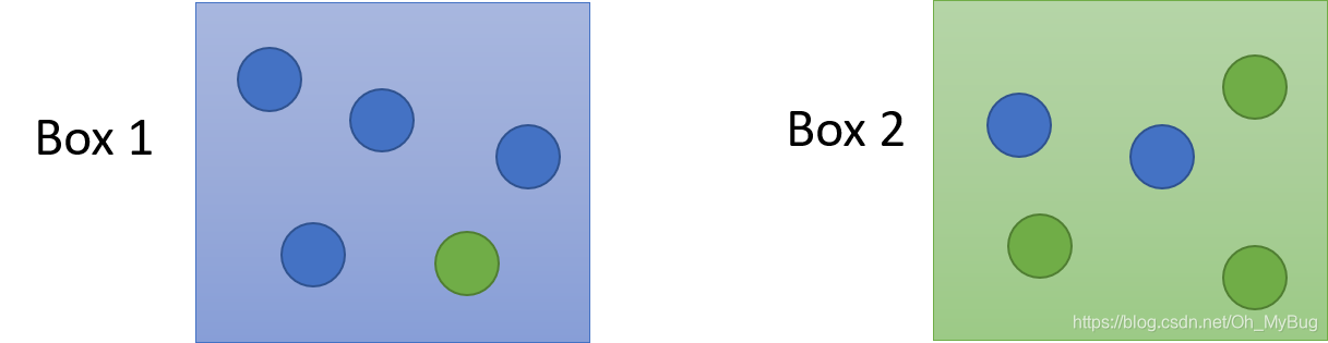 首先我们来看两个一模一样的盒子(Box 1 & Box 2),盒子里面放有蓝球和绿球,现在已知:
