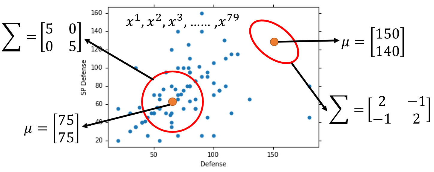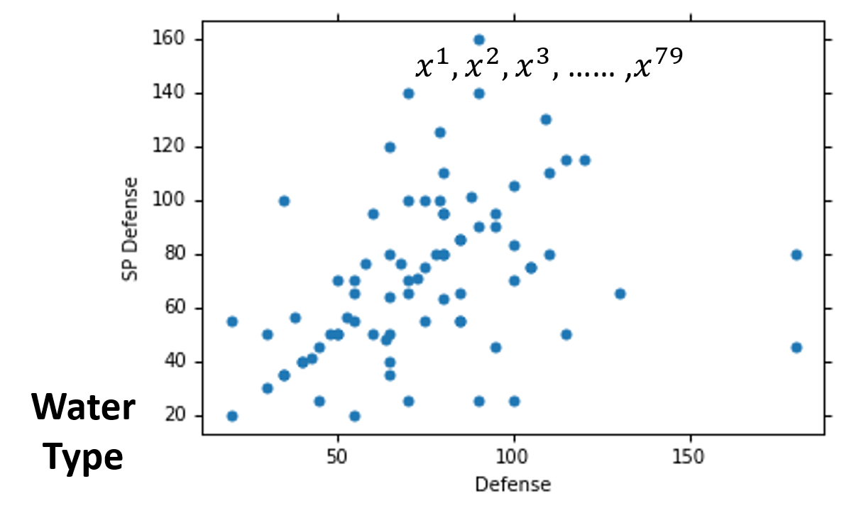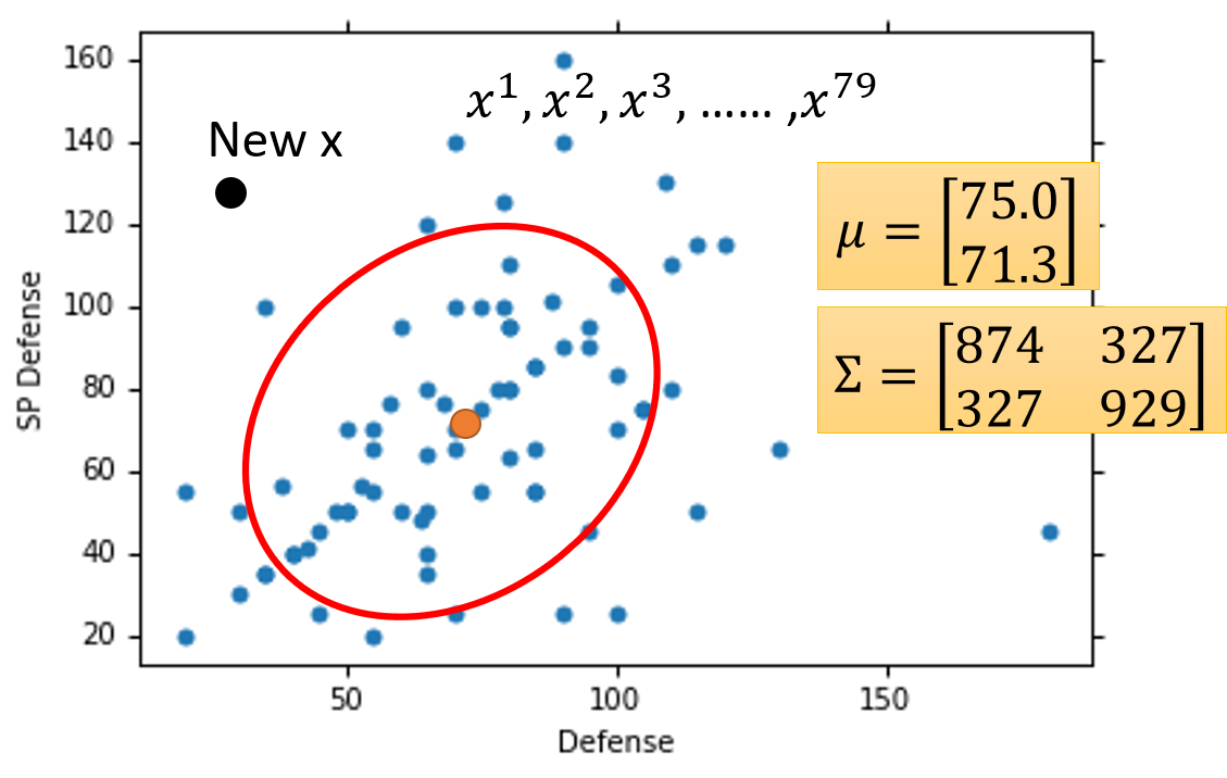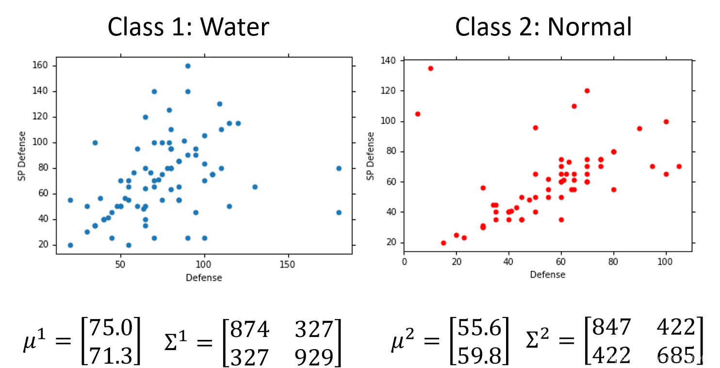 我们可以假设Water(水)系Pokemon精灵的概率分布满足Gaussian Distribution(高斯分布),而这79只Water(水)系精灵就是为了让我们算出这个Gaussian Distribution(高斯分布)的具体公式(自变量为Pokemon精灵的Defence和SP Defence),从而估测出这只Pokemon精灵 x x x是Water(水)系的概率。