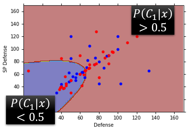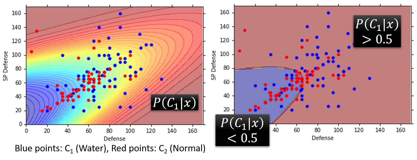 - 右图:图中以 P ( C 1 ∣ x ) = 0.5 P(C_1|x)=0.5 P(C1∣x)=0.5为分界线,蓝颜色代表 P ( C 1 ∣ x ) < 0.5 P(C_1|x)<0.5 P(C1∣x)<0.5,红颜色代表 P ( C 1 ∣ x ) > 0.5 P(C_1|x)>0.5 P(C1∣x)>0.5