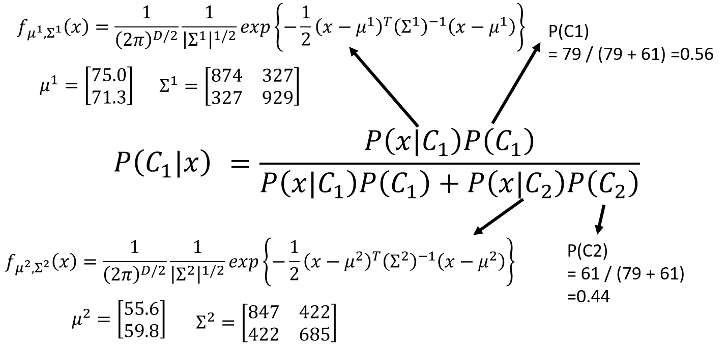 P ( C 1 ∣ x ) = P ( x ∣ C 1 ) P ( C 1 ) P ( x ∣ C 1 ) P ( C 1 ) + P ( x ∣ C 2 ) P ( C 2 ) P(C_1|x) = \frac{P(x|C_1)P(C_1)}{P(x|C_1)P(C_1)+P(x|C_2)P(C_2)} P(C1∣x)=P(x∣C1)P(C1)+P(x∣C2)P(C2)P(x∣C1)P(C1)