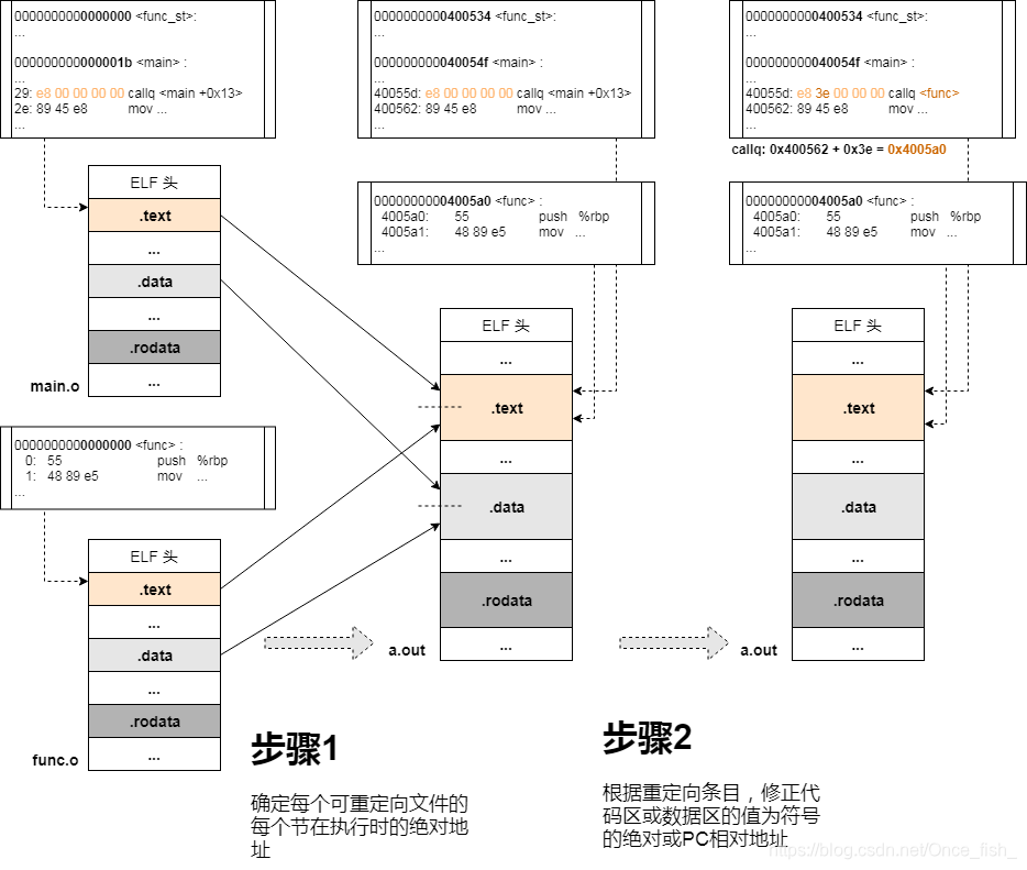 - 重定位节及符号定义。相同类型的节会被聚合到可执行文件的同一类型的节中,如下图的步骤一。符号解析过程已经确定了符号被定义的模块及节位置,所以重定位节后,每个符号的运行时地址也已经确定了。
