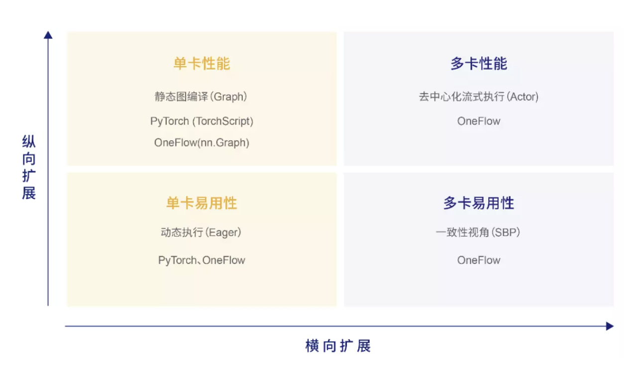 OneFlow分布式深度学习框架是基于对人工智能技术和应用发展需求的领先数年的前瞻性思考,针对超大规模训练、分布式、异构等带来的挑战,采用全新的“静态编译+流式系统”架构,突破了自动并行、静态调度、去中心化和全链路异步流式执行四大关键核心技术和一系列创新性难题,不仅能够大幅提升硬件资源利用率,而且能够简单方便地实现基于异构集群训练任务的大规模分布式扩展,将系统整体性能提升到极致。