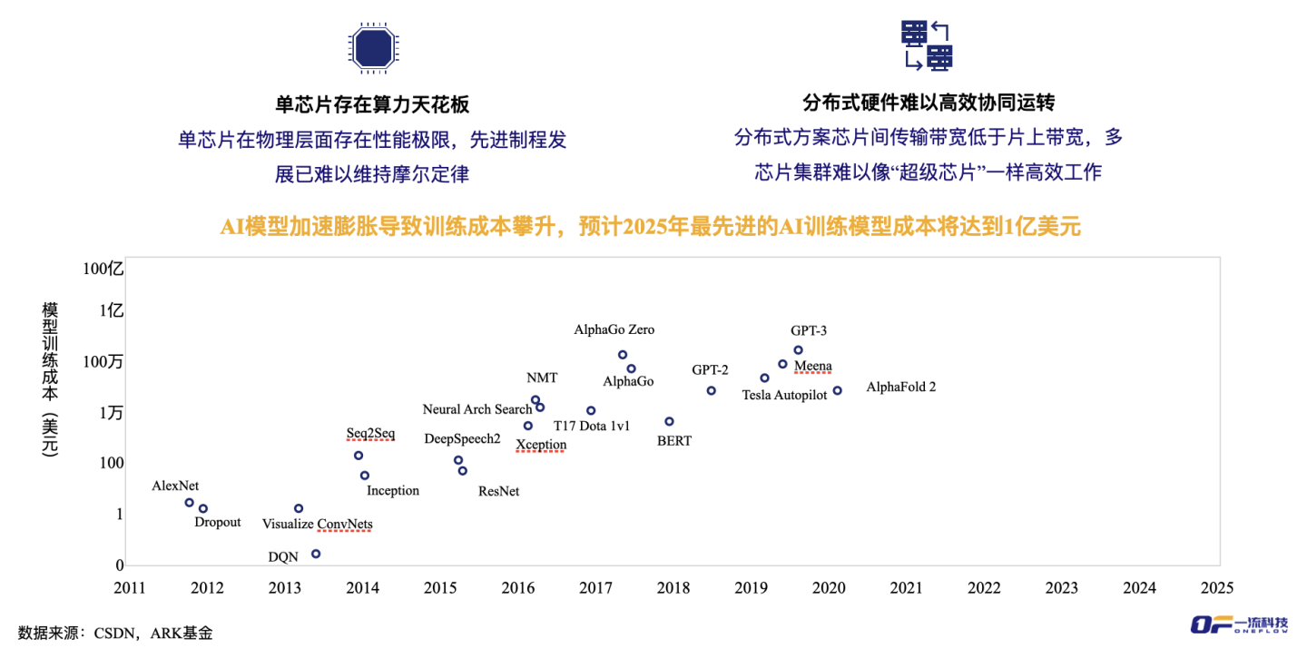 从BERT模型开始,GPT-2、GPT-3等超大模型不断出现,当超过千亿级别特征数量的模型成为常见现象时,硬件水平发展导致内存墙逼近算力的天花板。受限于物理定律,单一设备的算力及内存容量对持续提高芯片的集成越来越困难,难以满足大模型规模扩大的需要。