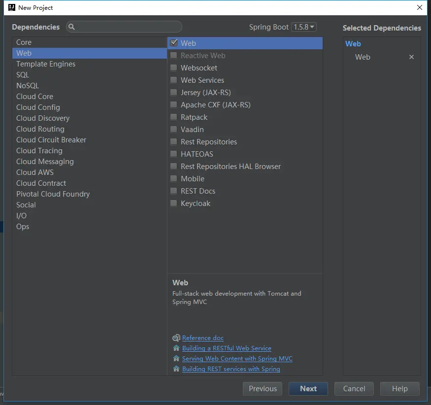 在下一步我们勾选Web依赖加入到我们的项目中,如下图所示: