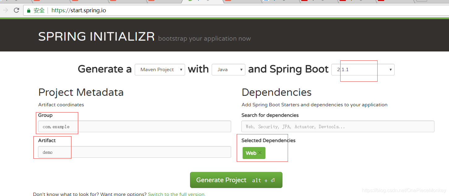 访问start.spring.io/网址就会看到如下 “图1” 界面: