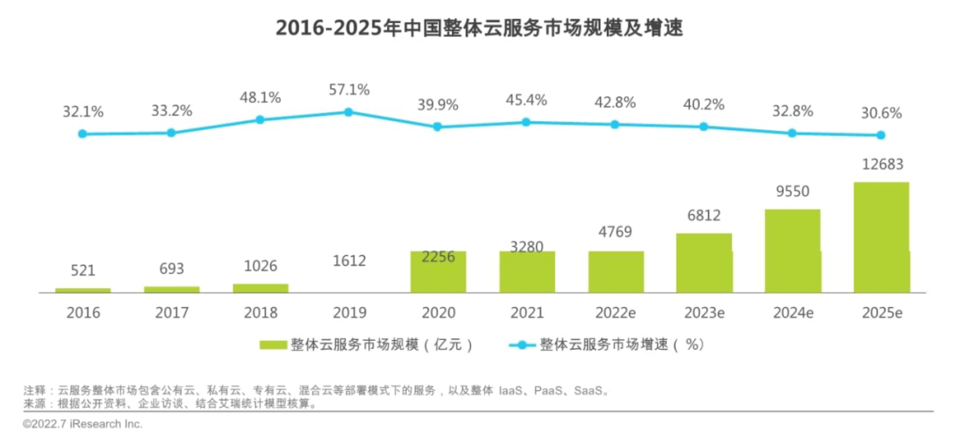 在中国云商的野蛮生长中,中国整体云服务市场规模在2021年达到3280.亿元,增速为45.4%。云服务目前在供给端已形成较为稳固的市场格局,上云、用云也在需求侧初步形成共识。但云巿场已经过了“概念变现“阶段﹐要从“能力变现”角度出发去探寻多元增长曲线,用长时间的技术能力升级、生态能力构建换取更广阔的巿场空间。