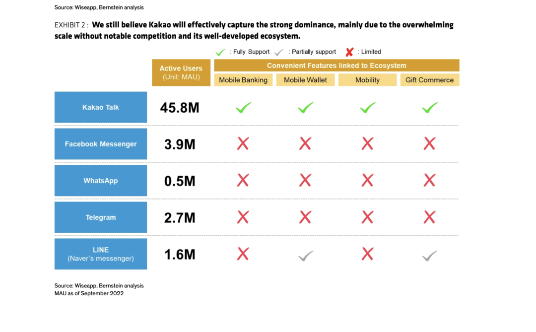 Kakao Talk是韩国最受欢迎的即时通讯应用,有韩国的“微信”之称,月活跃用户达到4300万名(韩国人口总数约5100万)。除此之外,Kakao旗下还有移动支付应用Kakao Pay、银行服务 Kakao Bank 、游戏应用Kakao Games、电商平台Zigzag、门户网站Daum和交通服务应用程序Kakao T等。